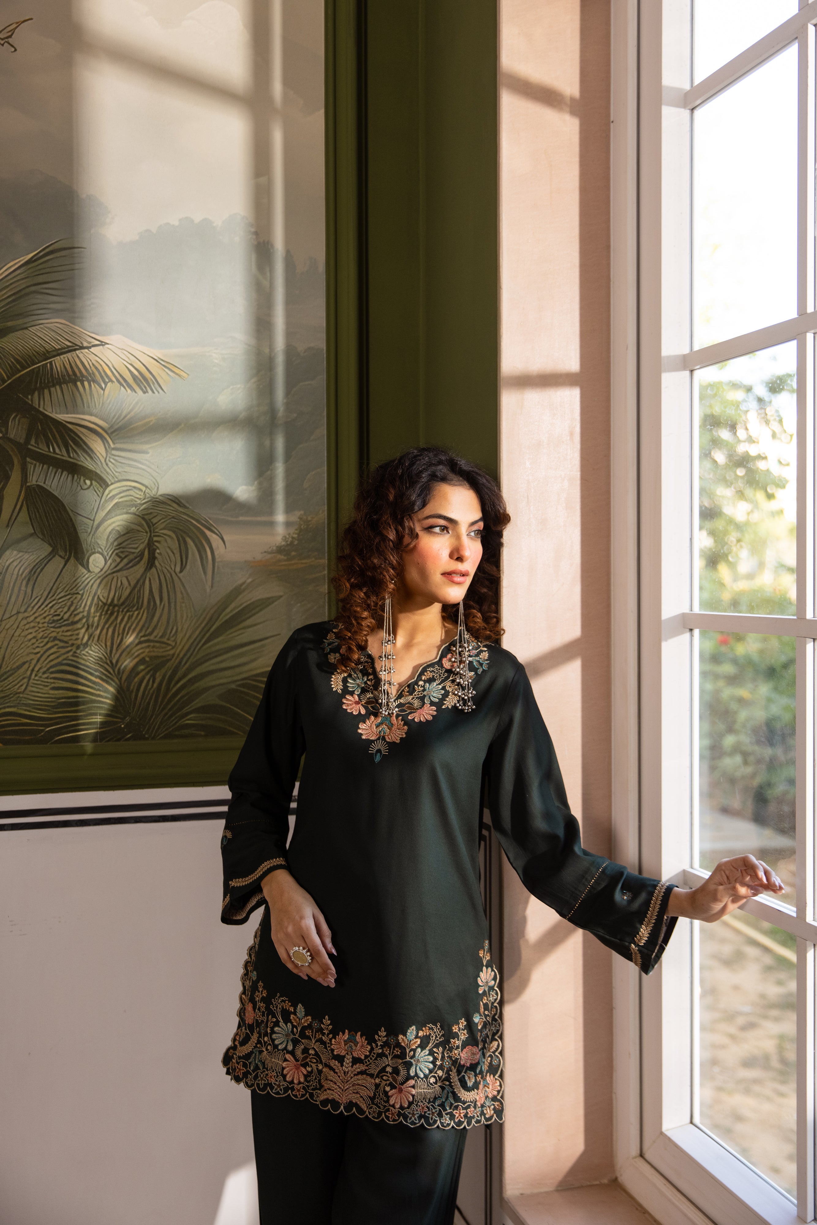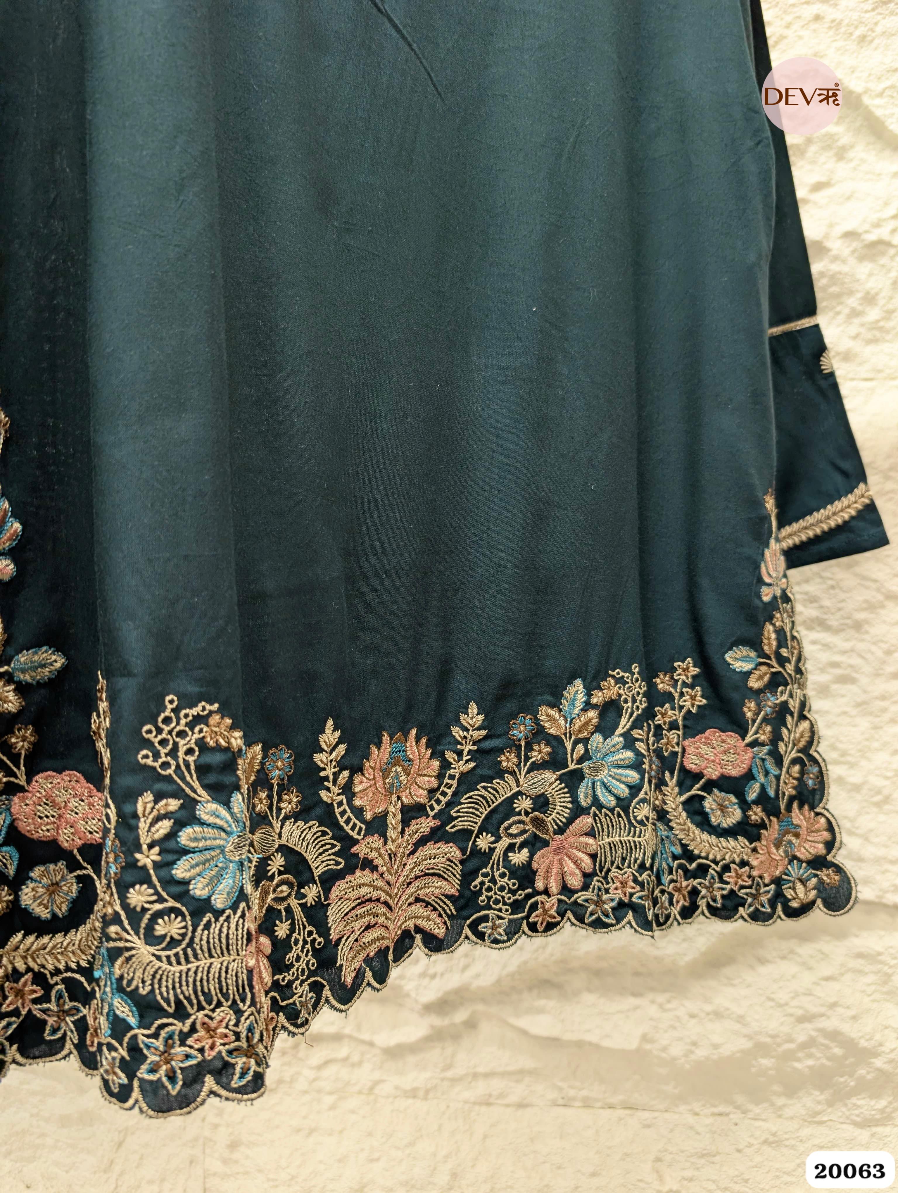 An elegant teal ensemble tailored in smooth German reyon, adorned with intricate multicolour floral embroidery along the neckline and a richly detailed embroidered hem. The straight-cut silhouette with softly flared sleeves and delicate border accents lends a graceful, refined finish to this contemporary ethnic set.