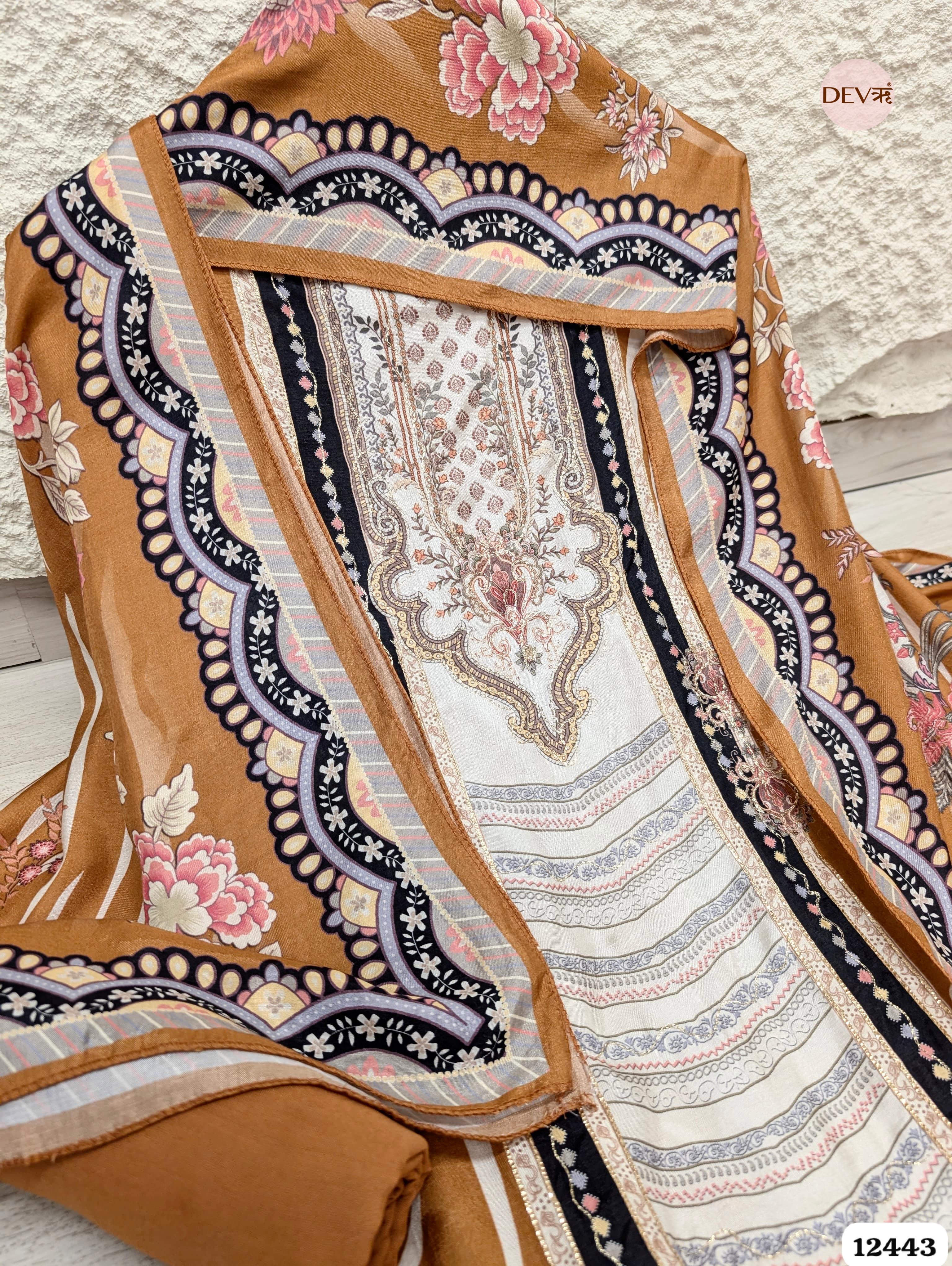This striking ensemble features a rich rust orange and earth-toned palette, adorned with intricate digital prints that blend bold floral motifs with contemporary geometric patterns. Crafted from luxurious, smooth muslin fabric, the design is highlighted by a sophisticated ornamental yoke and detailed borders, offering a refined and vibrant aesthetic characteristic of Devri’s premium collection.