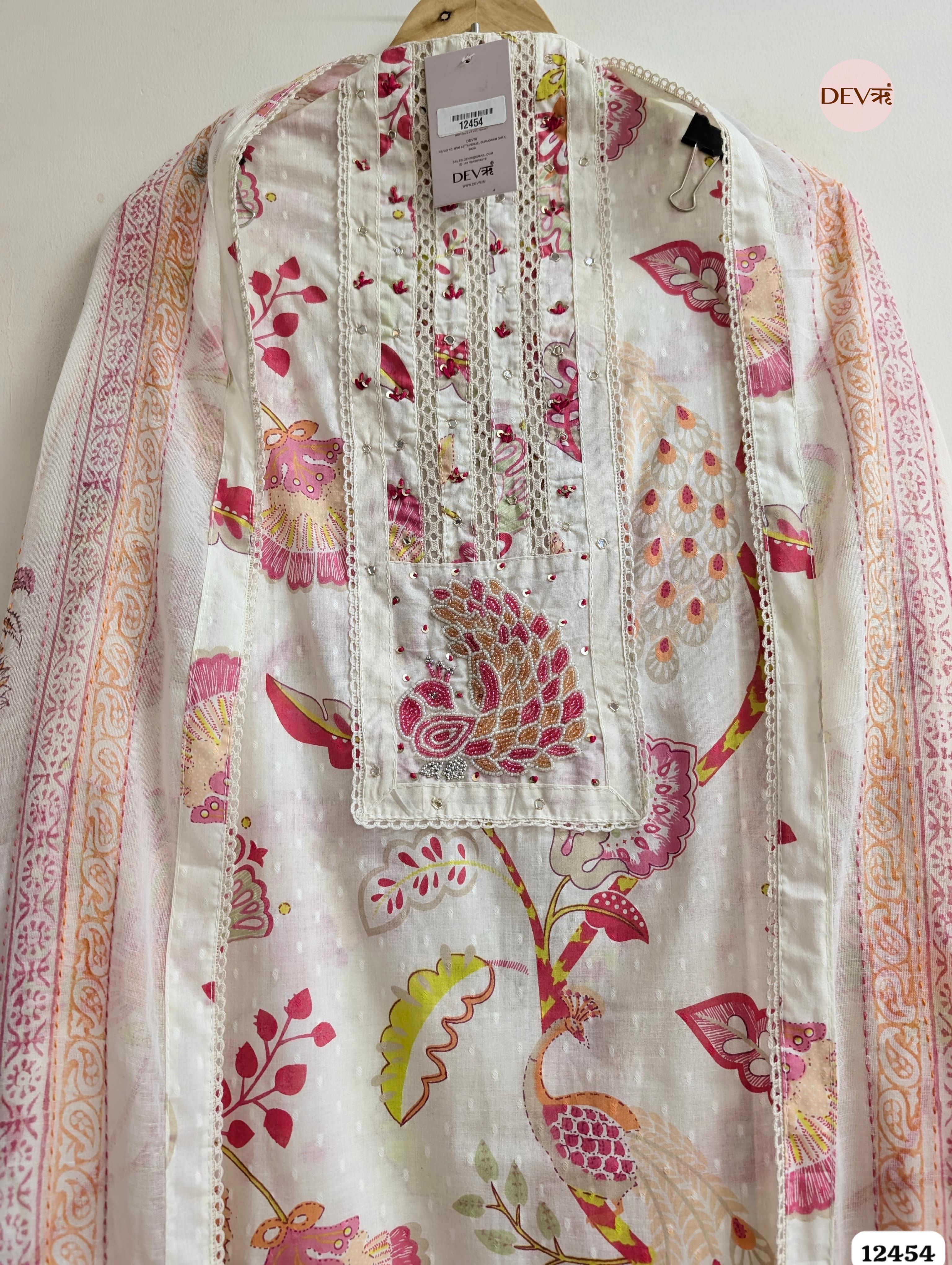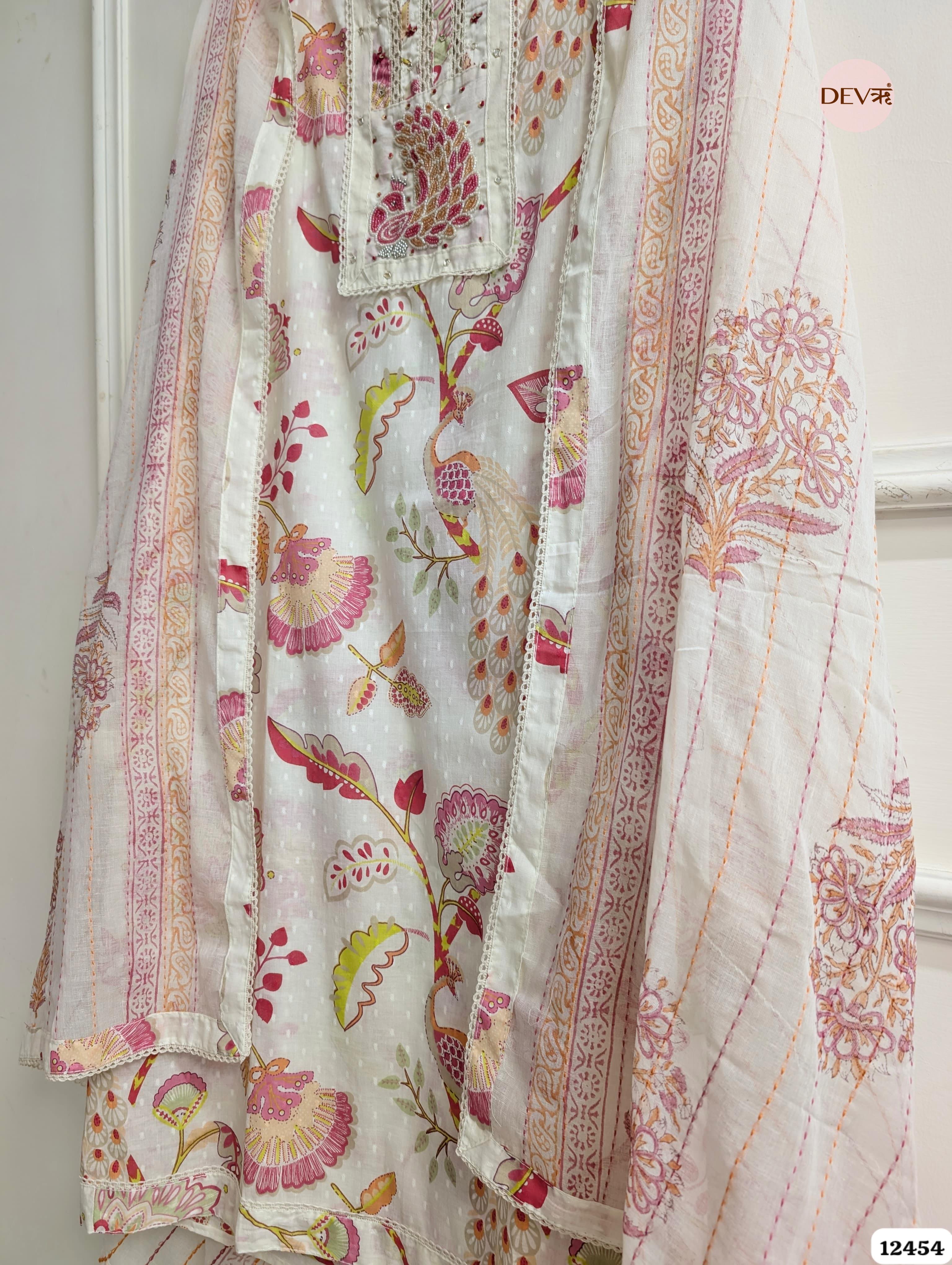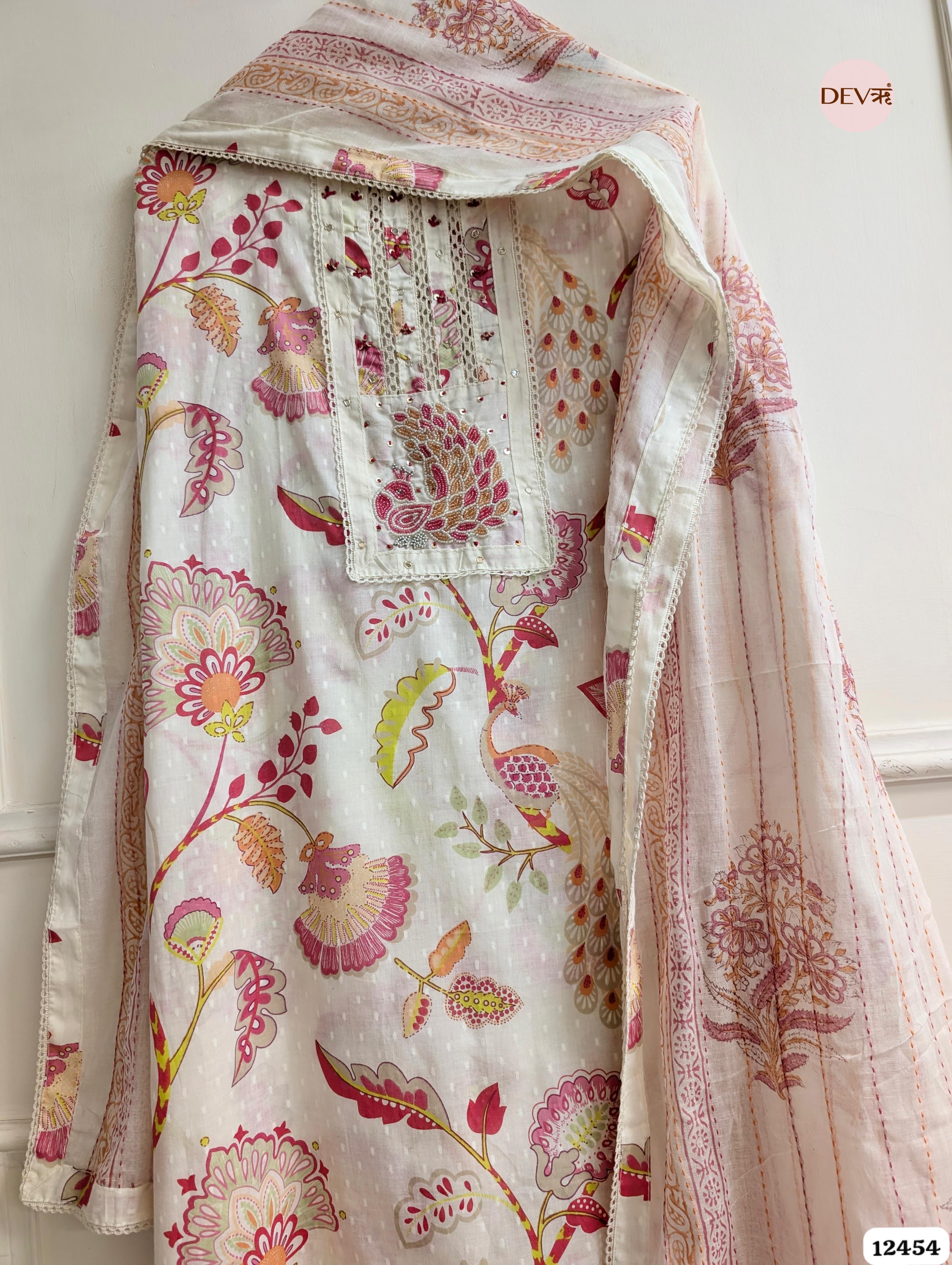 A whimsical cream ensemble brought to life with vibrant pink and gold-toned prints featuring majestic peacock and floral motifs. The design is elevated by an ornate embroidered peacock patch on the yoke and delicate lace inserts, capturing a refined, nature-inspired aesthetic.
