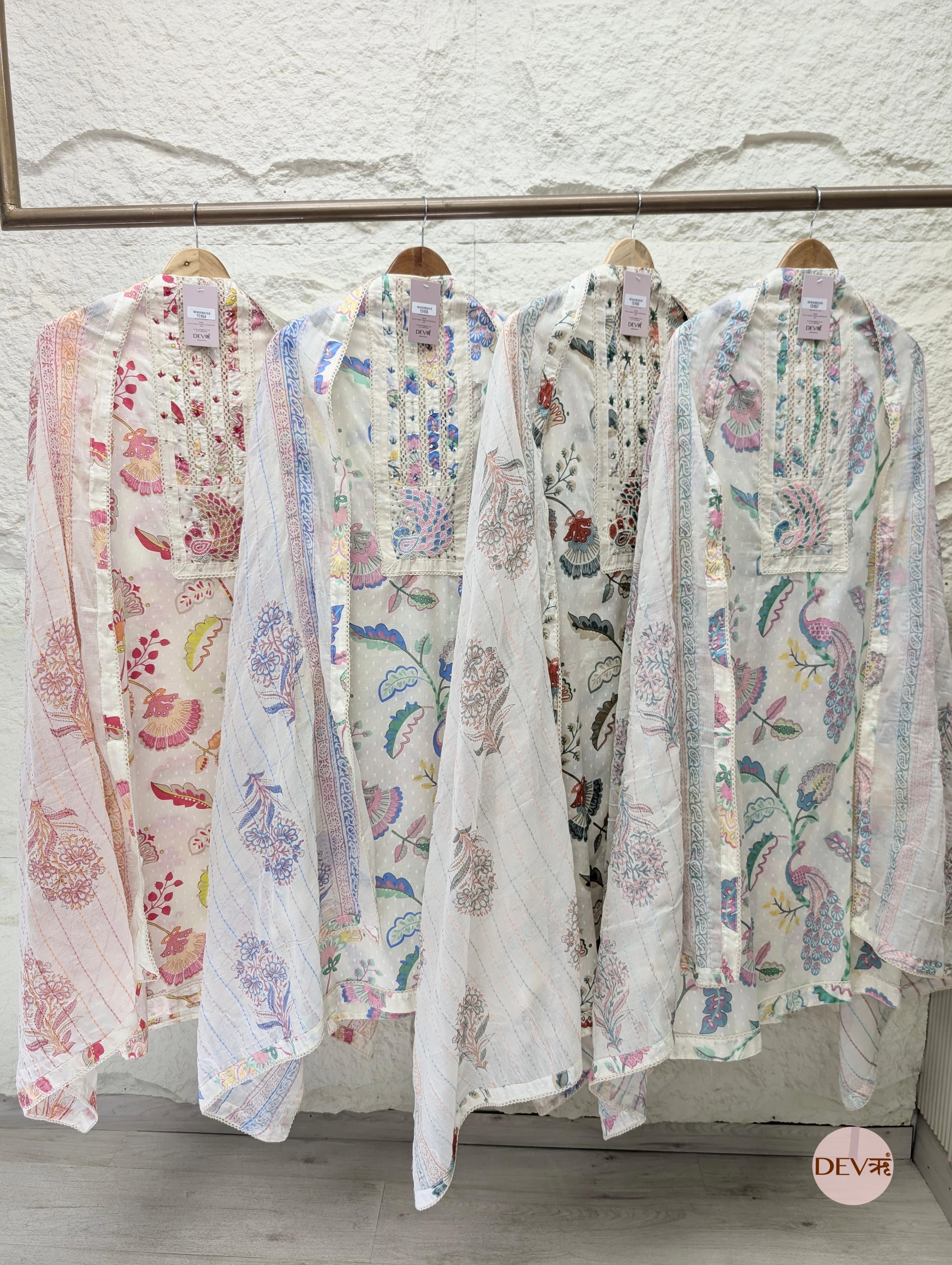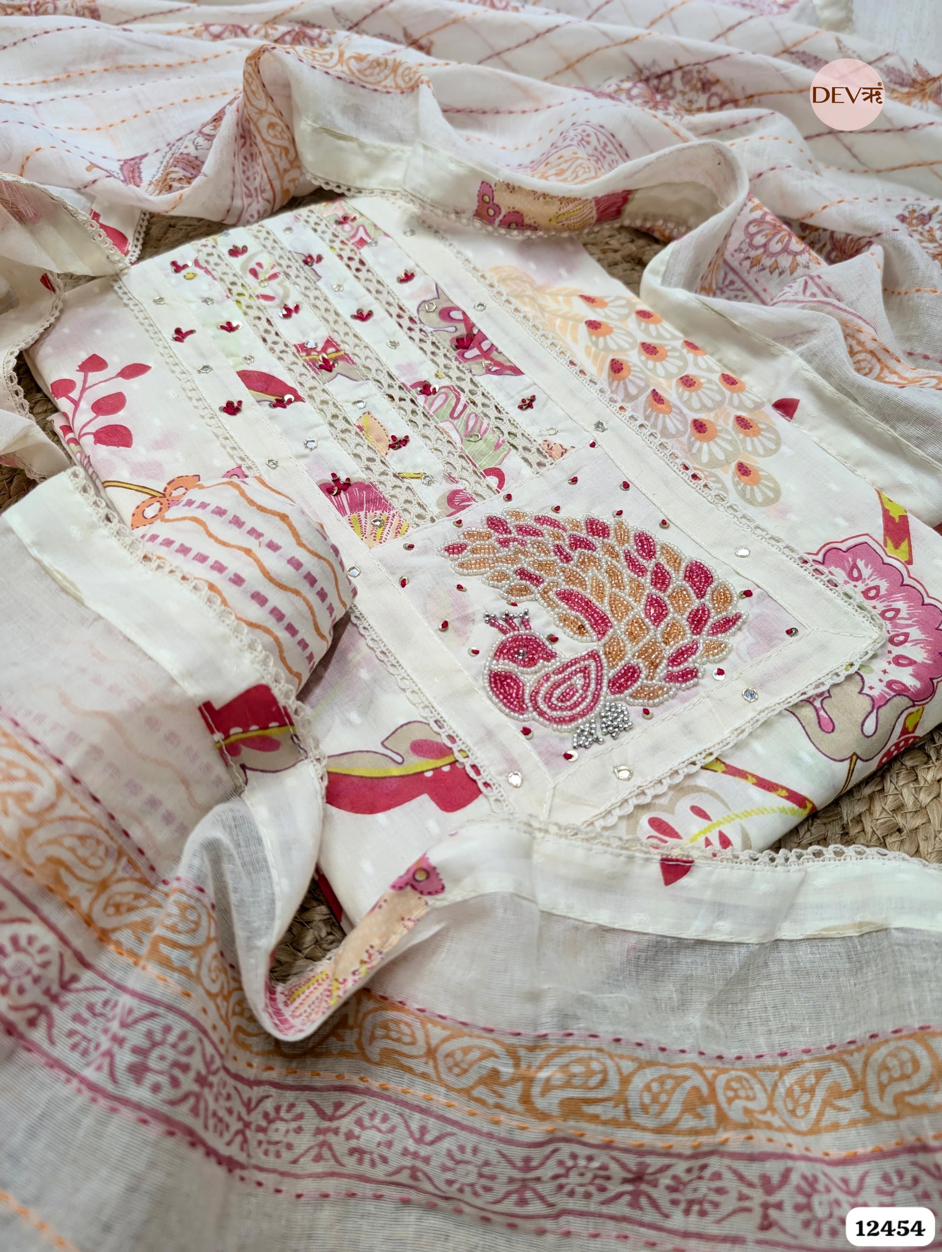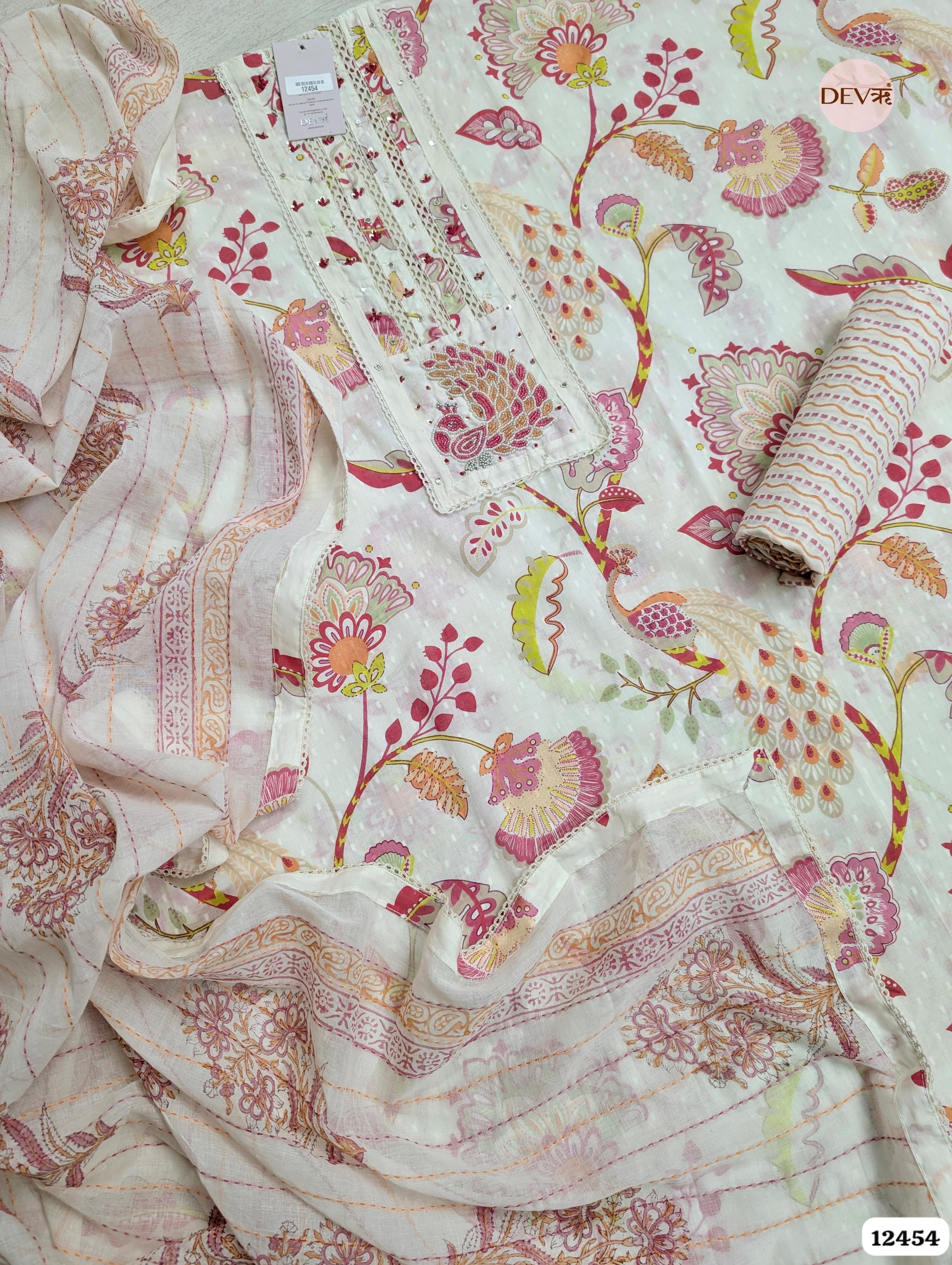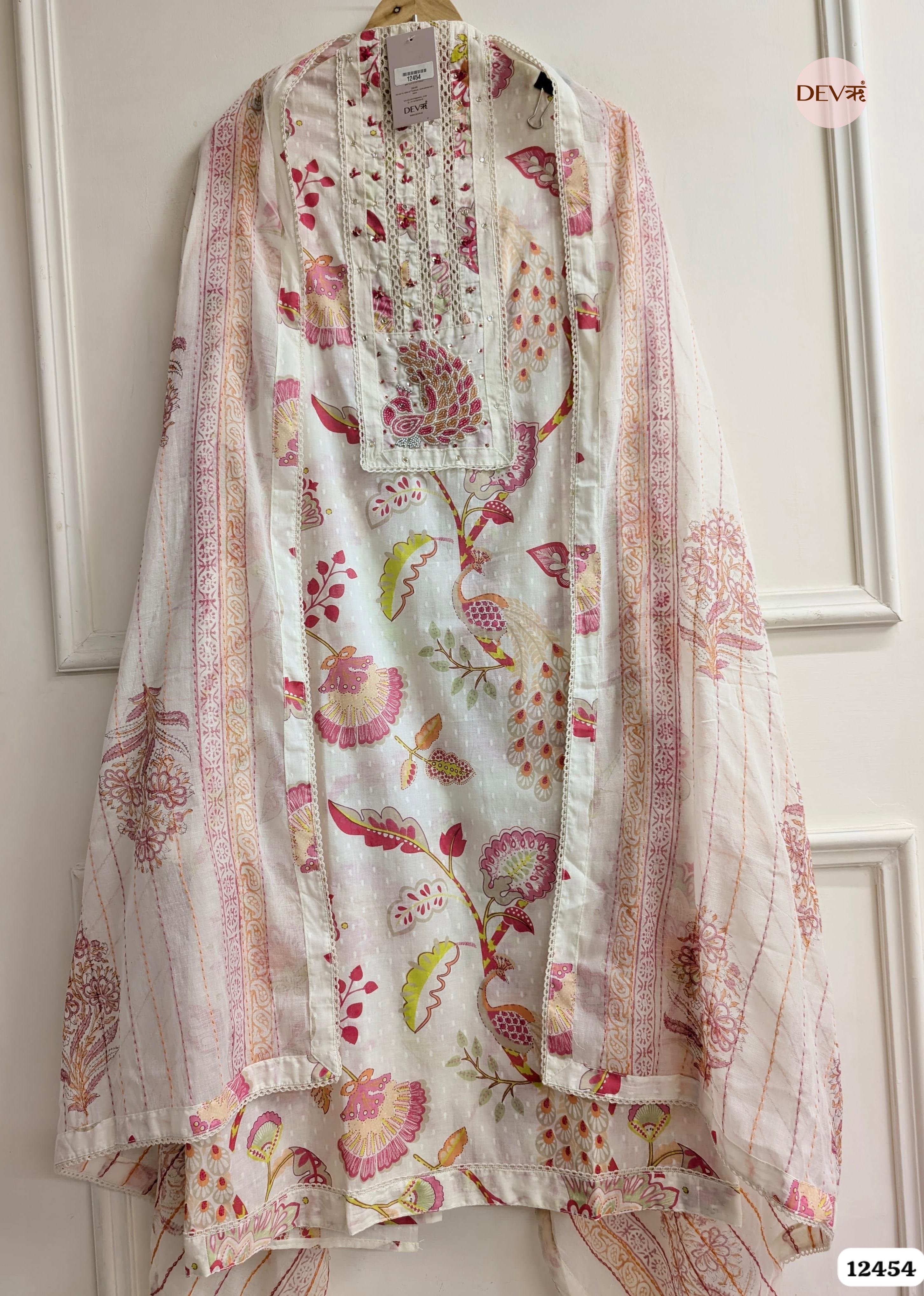A whimsical cream ensemble brought to life with vibrant pink and gold-toned prints featuring majestic peacock and floral motifs. The design is elevated by an ornate embroidered peacock patch on the yoke and delicate lace inserts, capturing a refined, nature-inspired aesthetic.