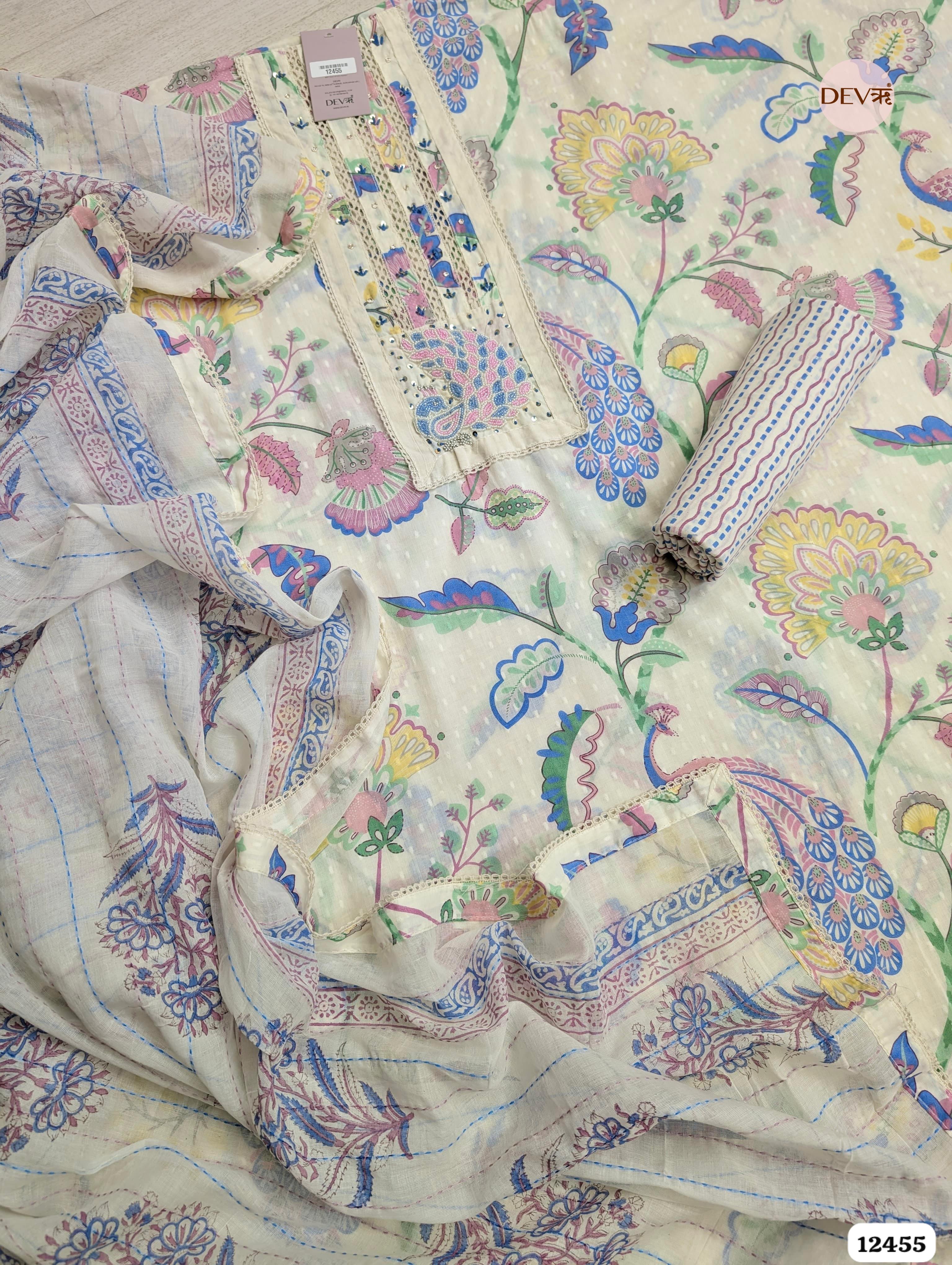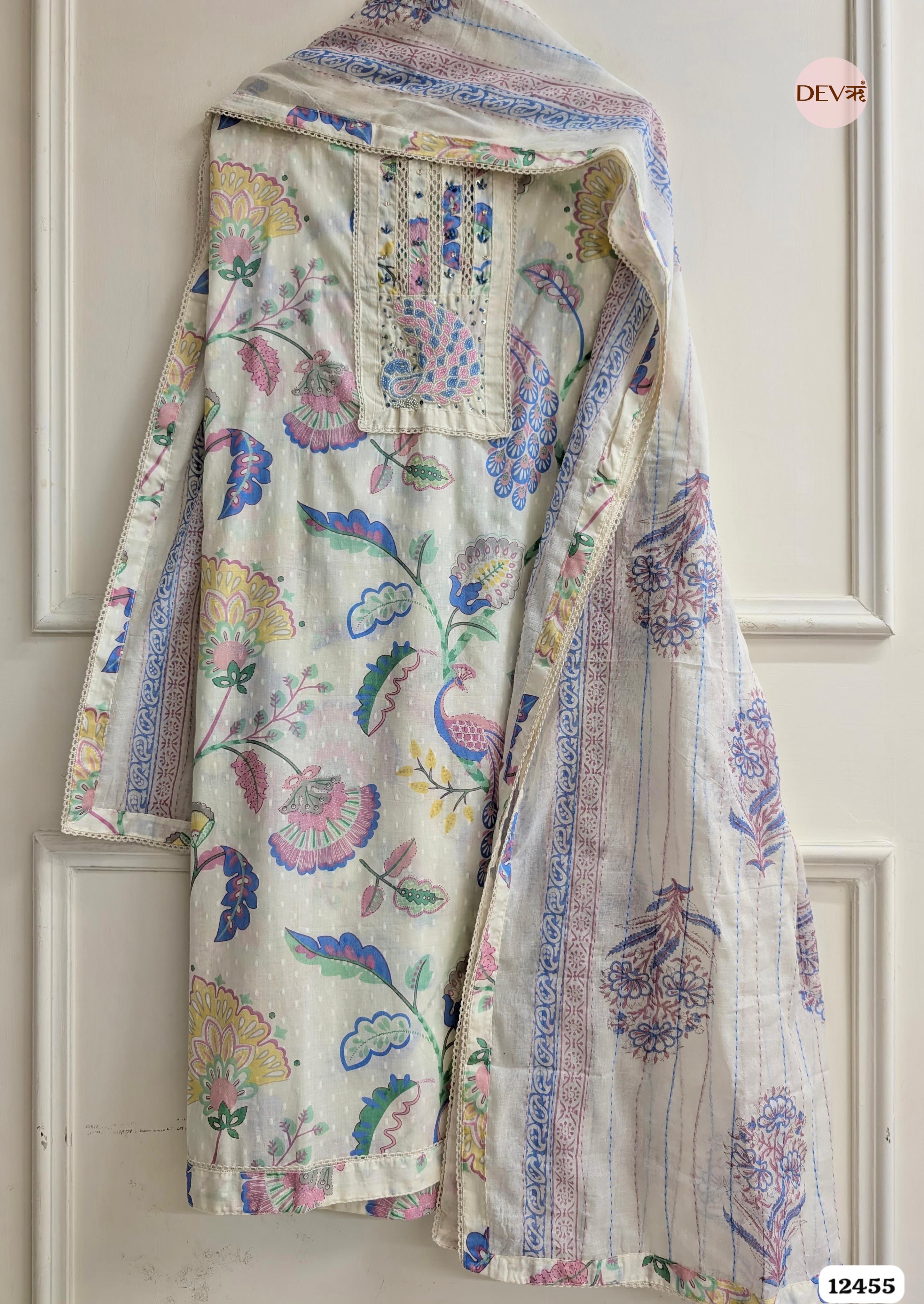 A serene cream ensemble featuring vibrant blue and multi-colored peacock motifs amidst a garden of floral vines. This pure cotton set is enhanced with an intricately embroidered peacock yoke and delicate lace inserts, offering a refreshing and artistic look for the season.
