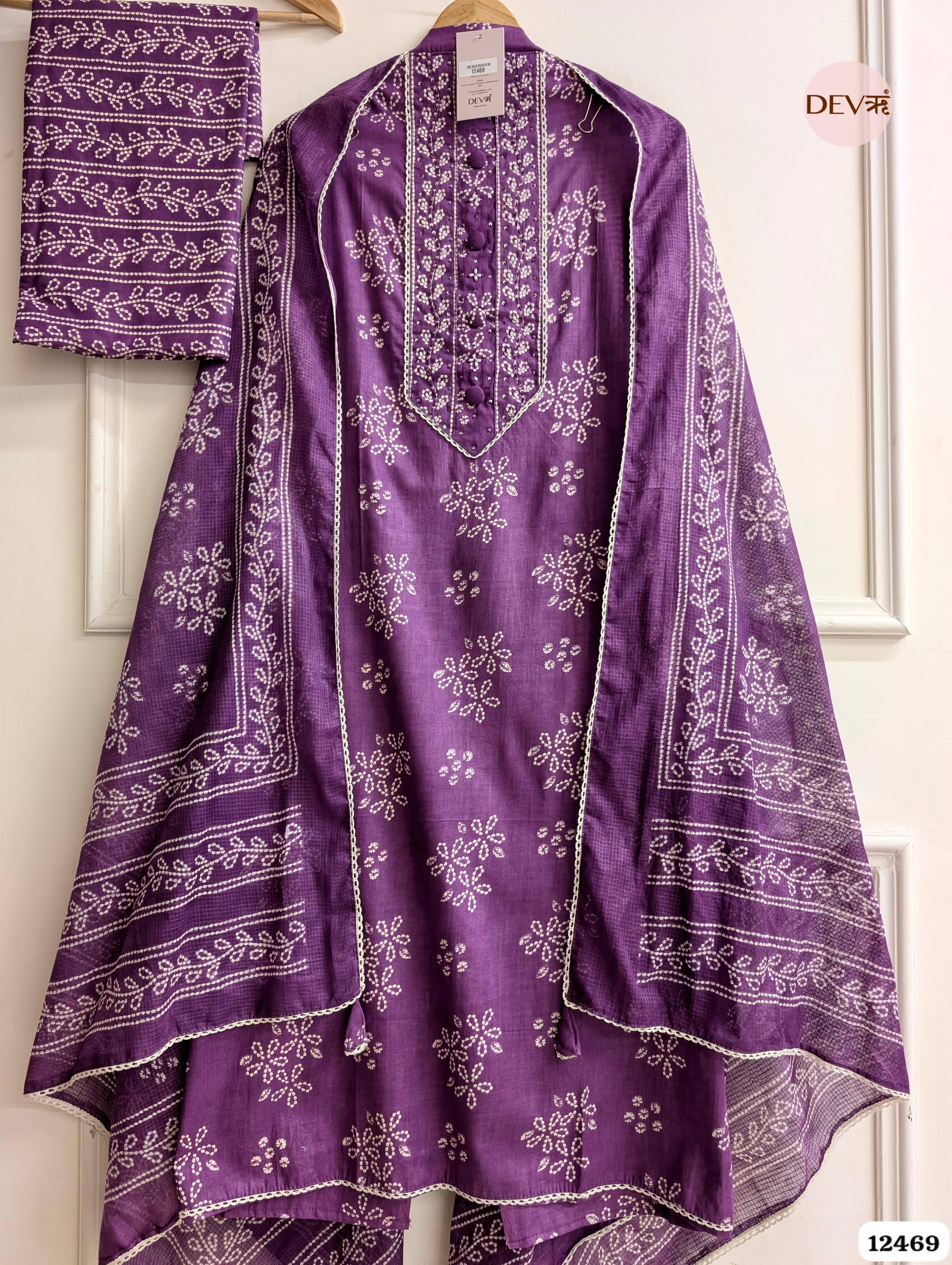 A rich and sophisticated purple ensemble that exudes effortless elegance through its detailed craftsmanship. The deep hue is beautifully contrasted by delicate white floral embroidery and refined button detailing, offering a breathable and comfortable texture that maintains Devri's signature polished aesthetic.