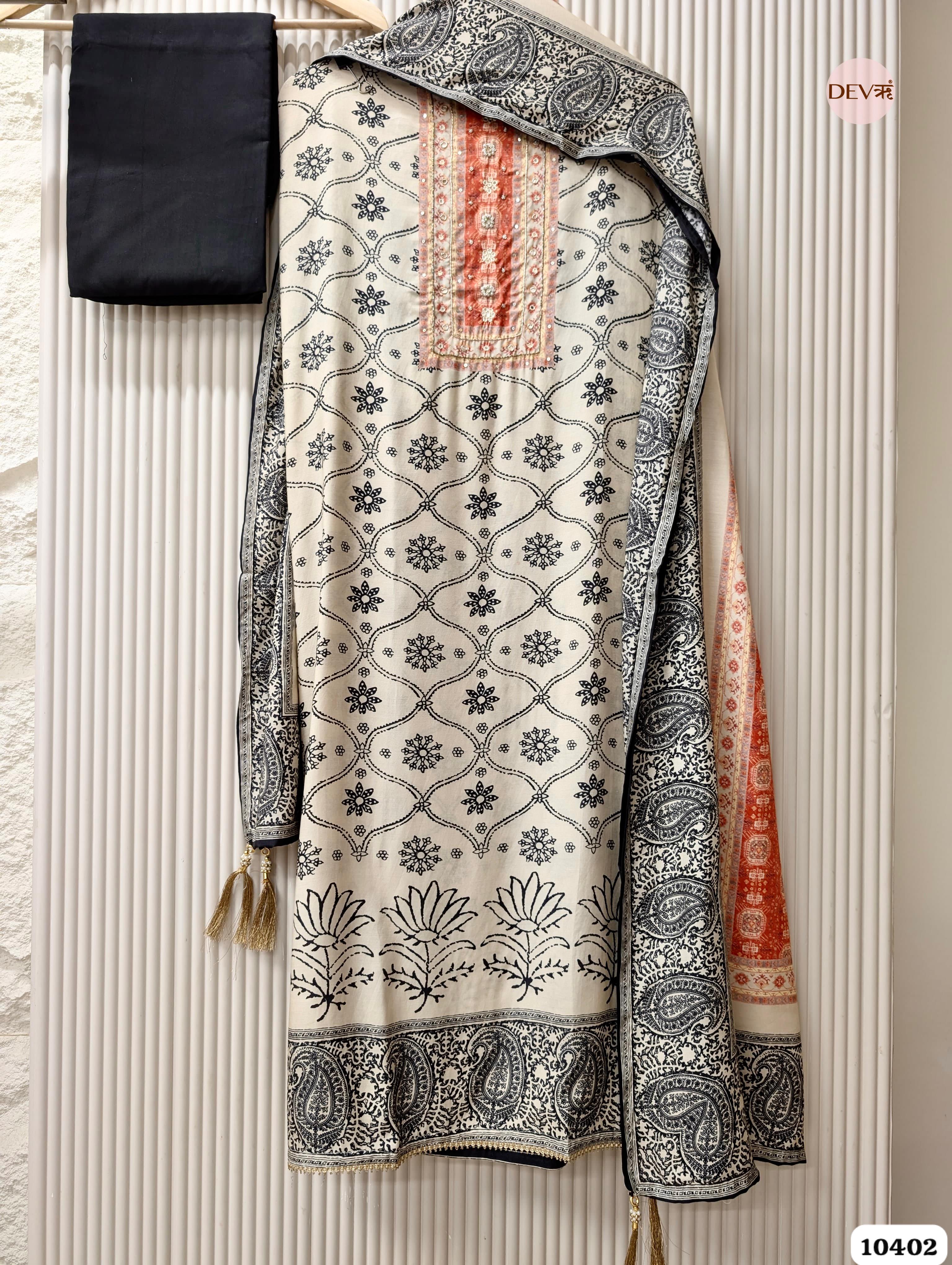 Dupatta Fabric Details: Fabric: Muslin Detailing: Coordinating beige base with a wide black paisley print border and coral accents, finished with elegant golden tassels on the corners.