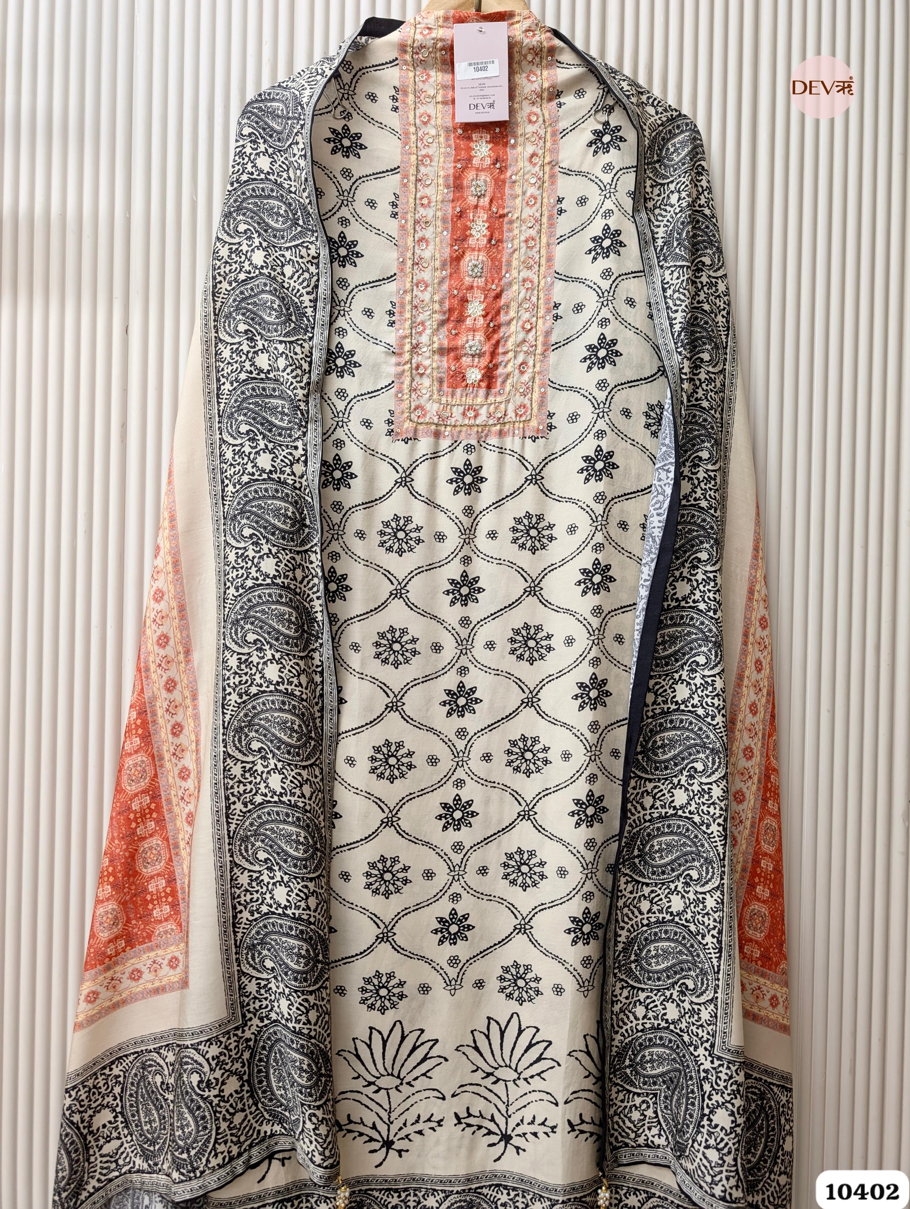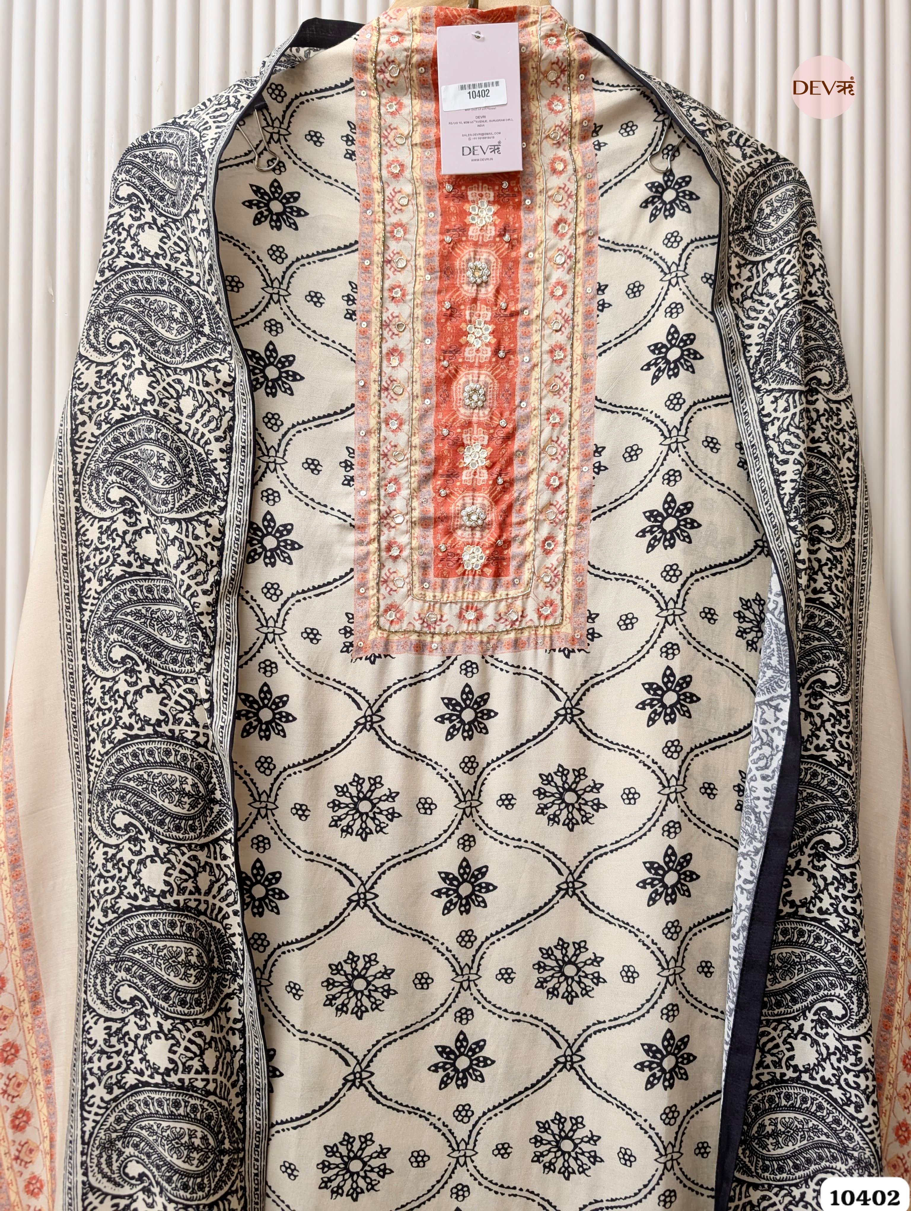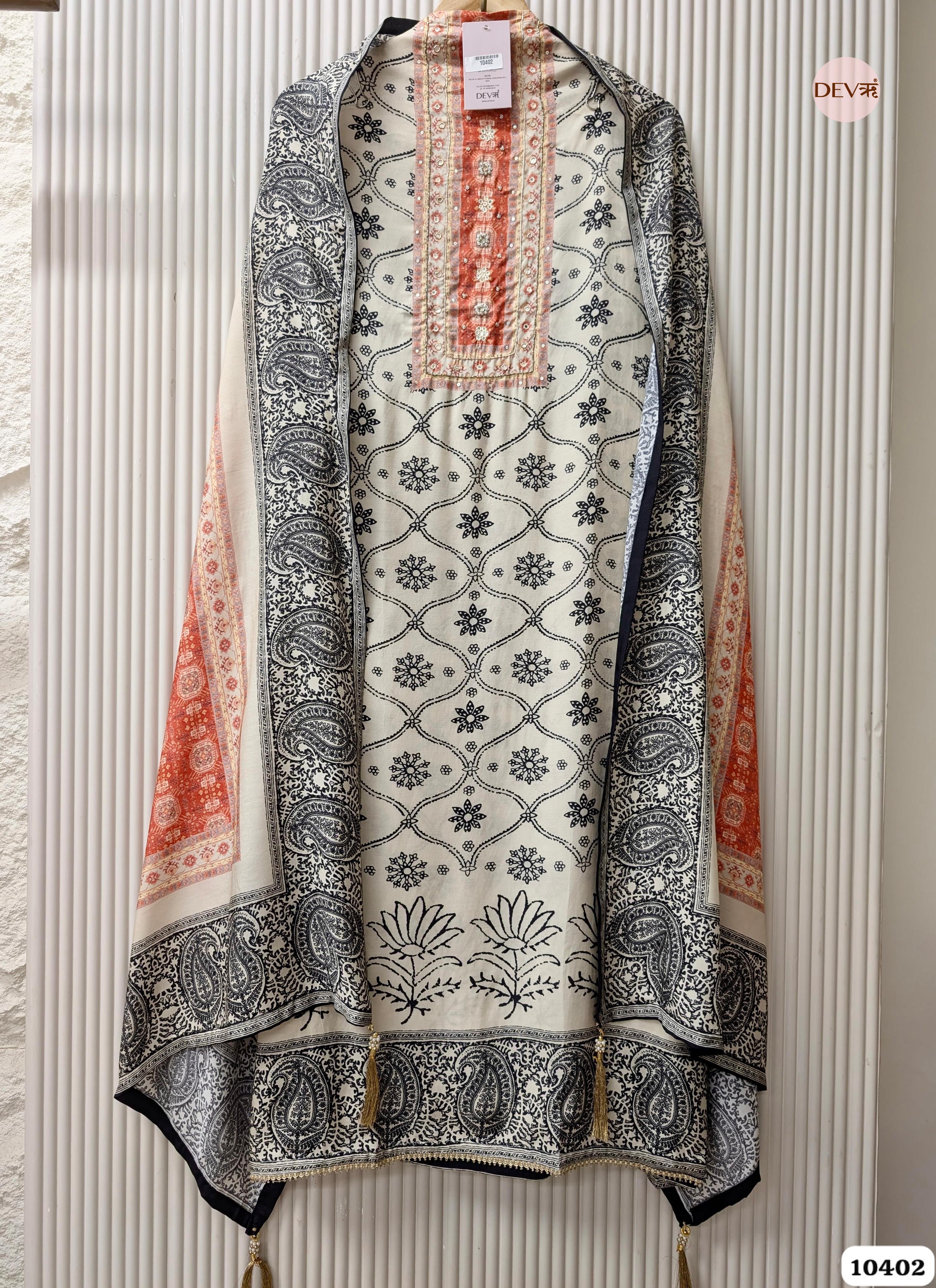 Elevate your ensemble with this sophisticated beige muslin suit, featuring a refined interplay of traditional block-print aesthetics and contemporary design. The shirt is detailed with an intricate trellis pattern and a vibrant coral embroidered neckline, while the flowing muslin dupatta showcases a bold paisley border, offering a graceful silhouette for any elevated occasion.