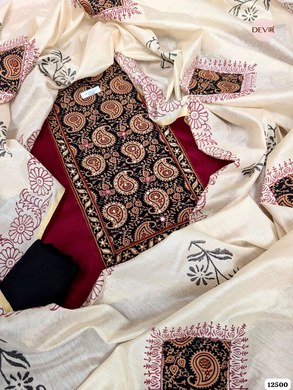 A sophisticated fusion of traditional motifs and contemporary contrast, this ensemble features a rich paisley printed shirt in deep maroon and black. The intricate detailing is highlighted by shimmering mirror-work accents on the central panel, paired with a soft off-white dupatta featuring artistic block-print style borders for a look of timeless elegance.