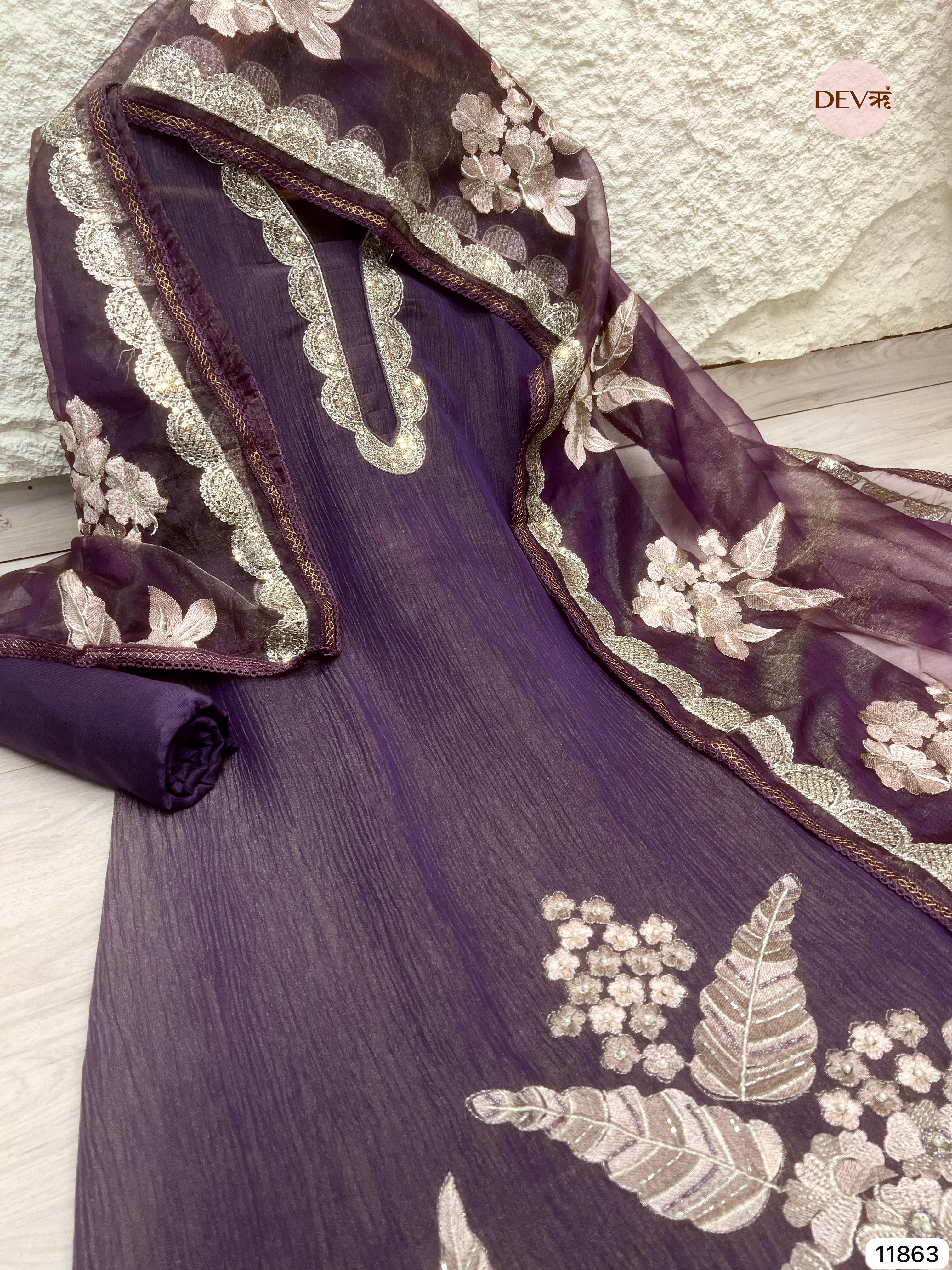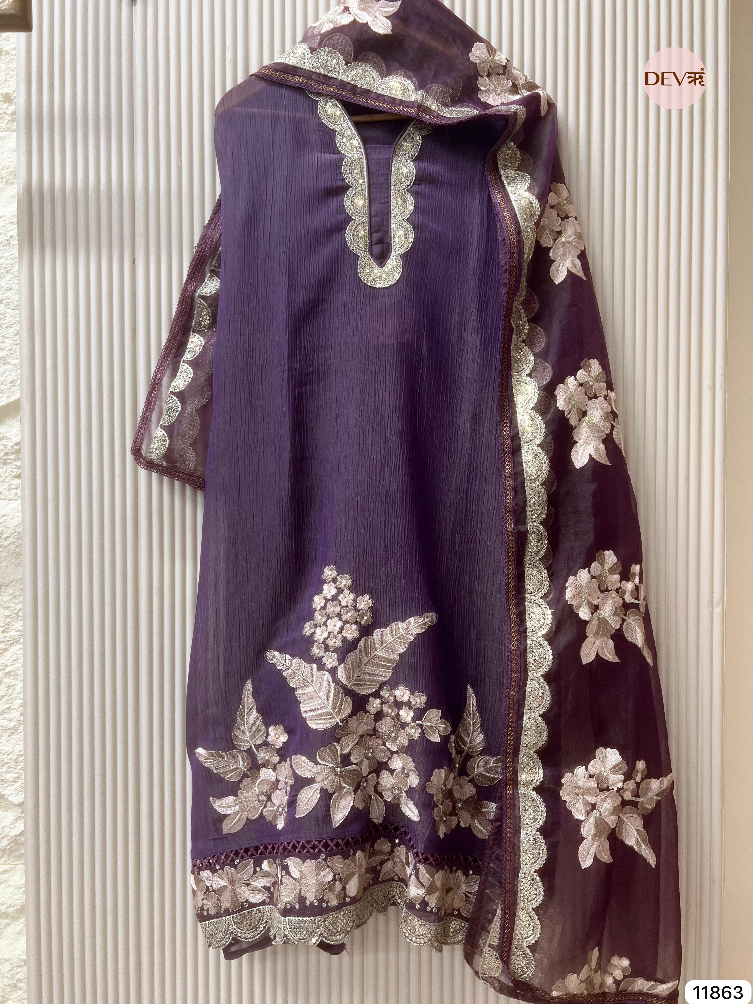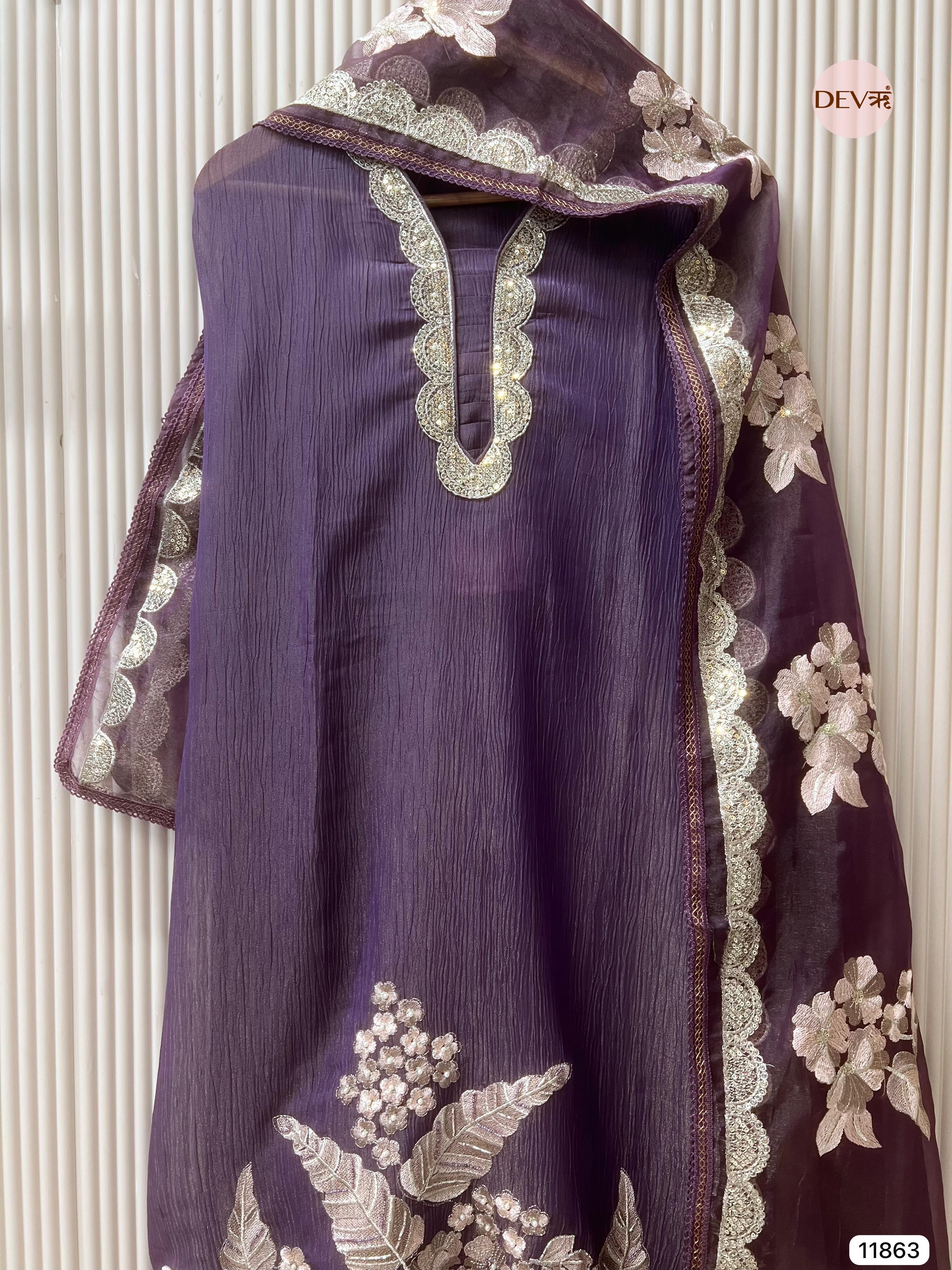 Purple Tissue crush silk unstitched embroidered -Set Of 3
