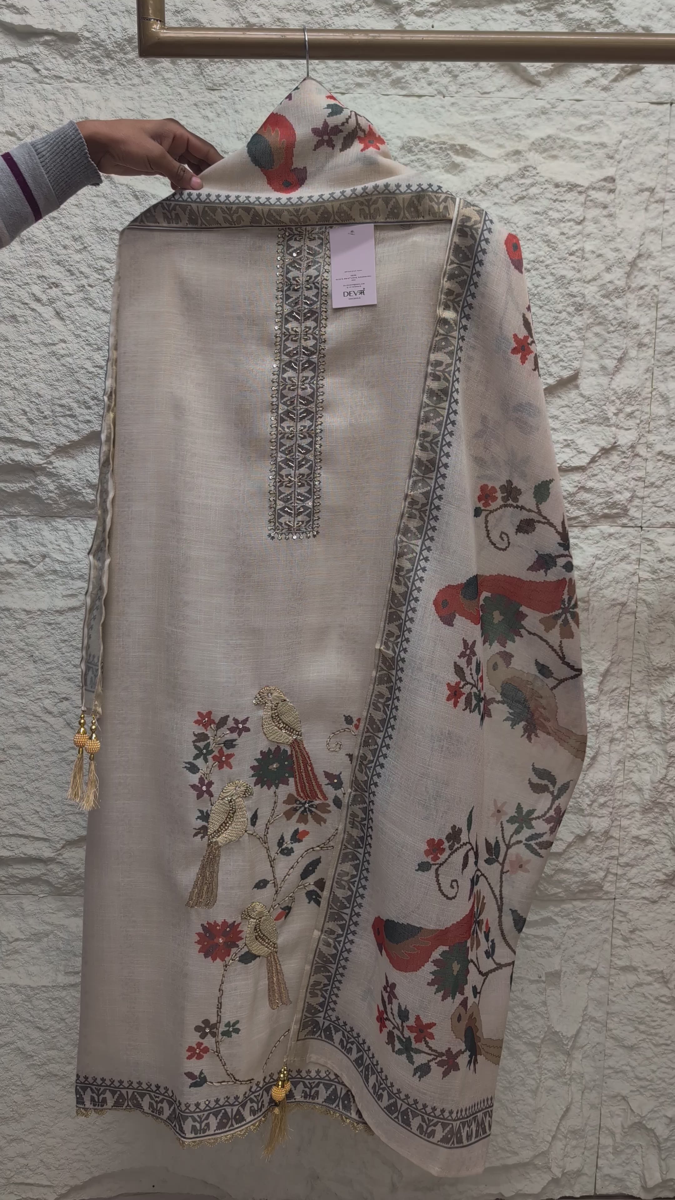 A graceful ivory unstitched three-piece suit crafted in breathable linen cotton, featuring delicate embroidered bird motifs paired with subtle printed borders. The soft texture and balanced detailing create a refined composition that reflects Devri’s signature understated elegance.