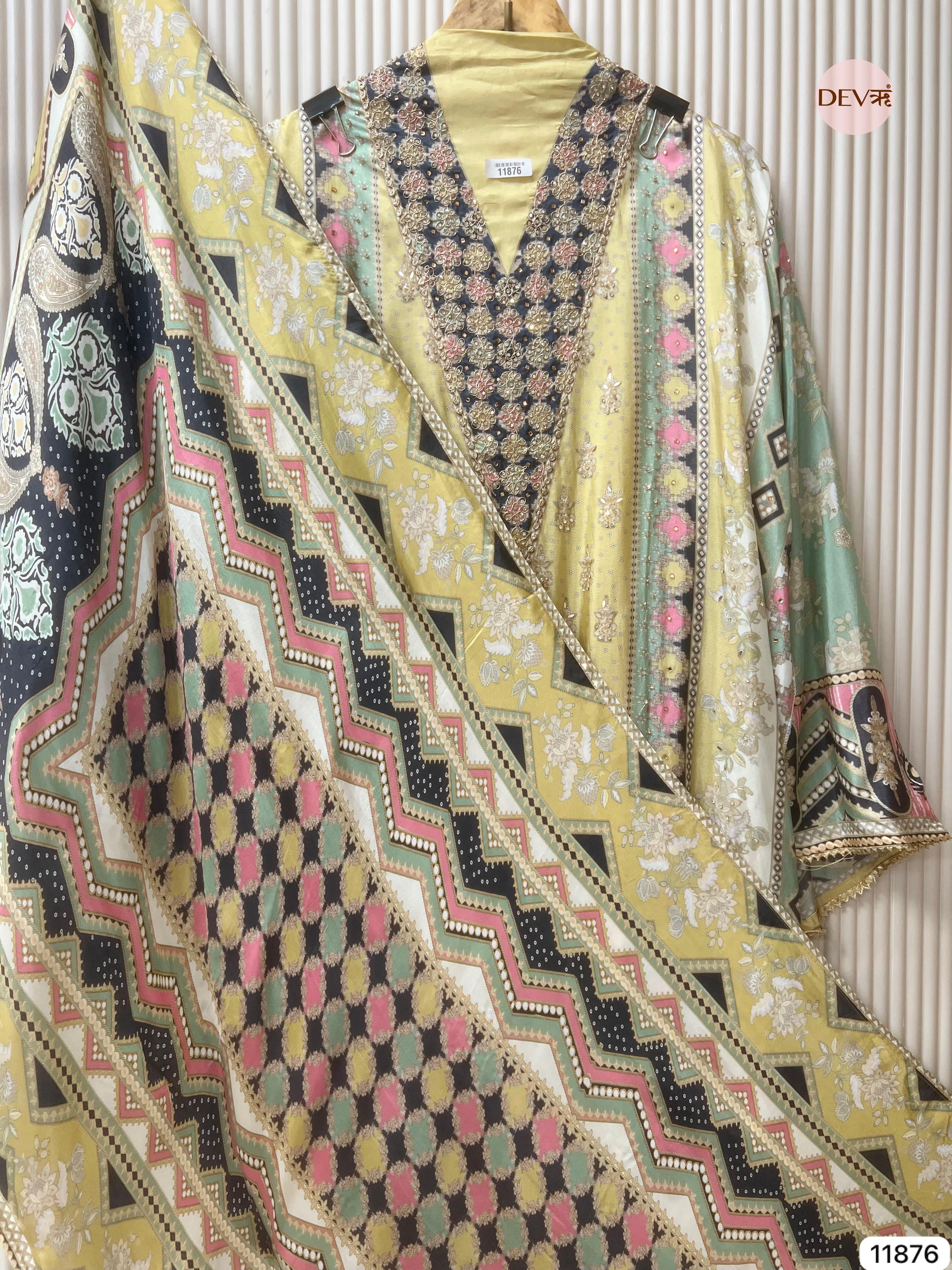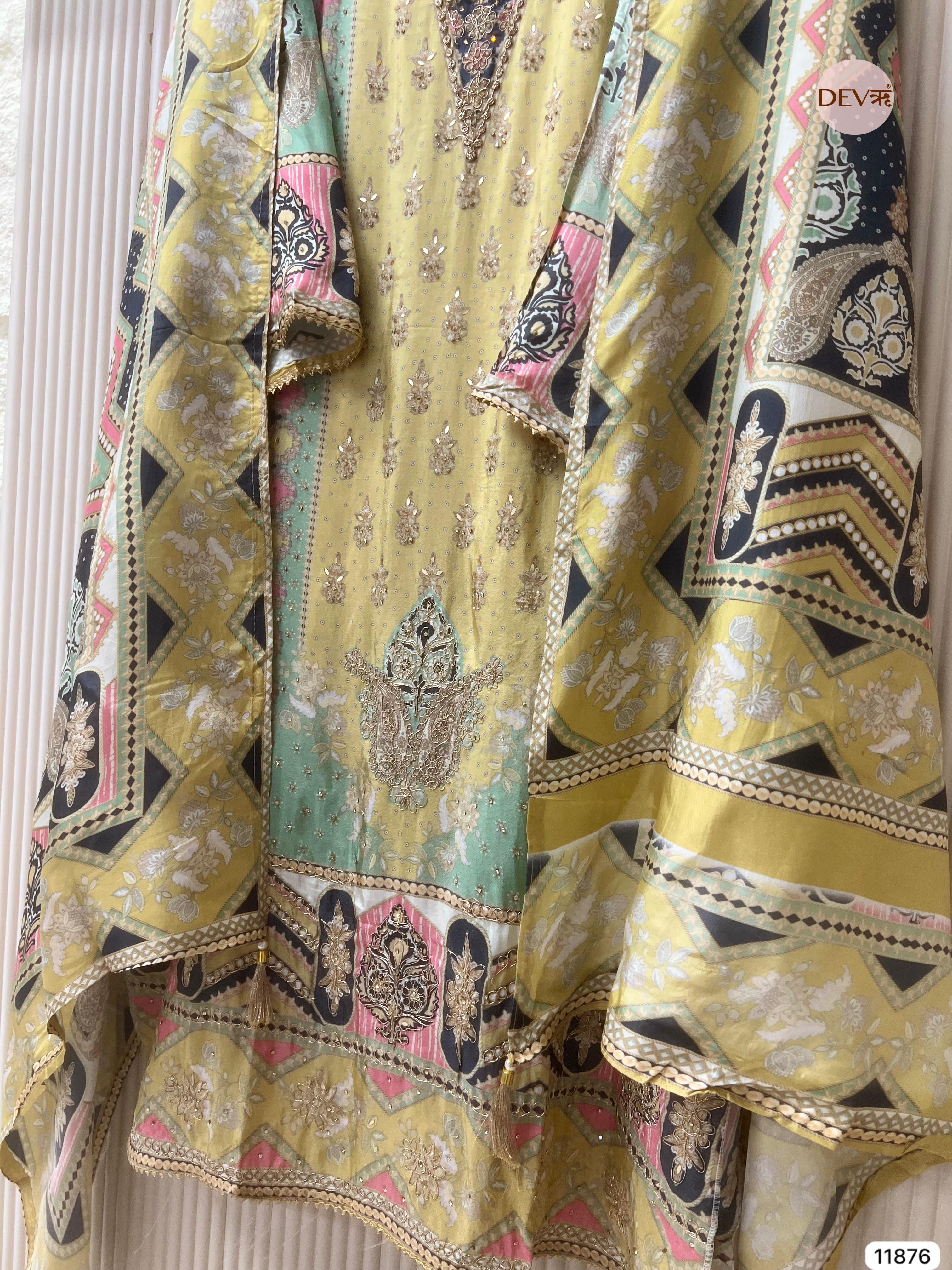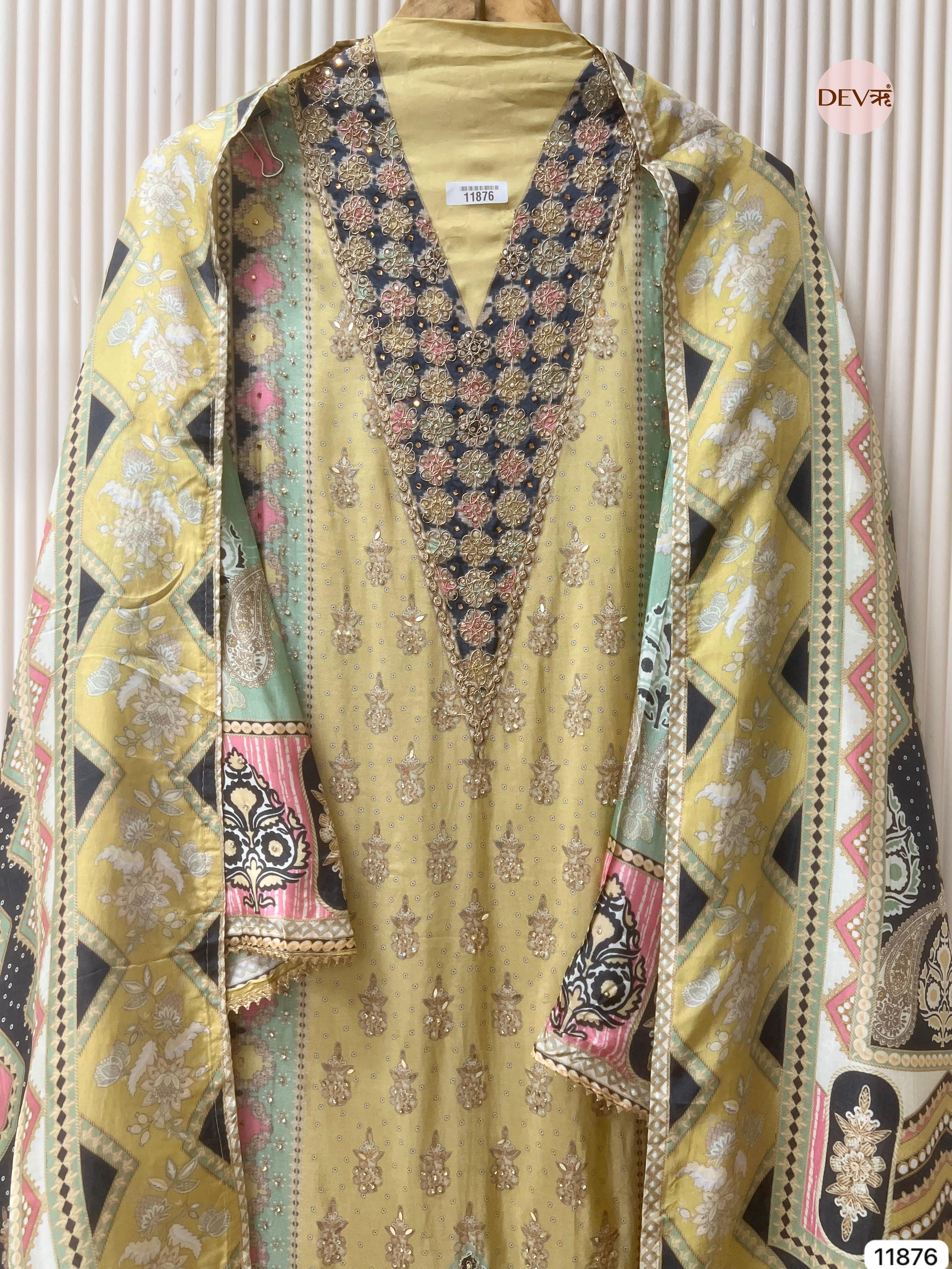 Yellow Glass Silk Semi Stitched Pakistani Printed Hand Embroidered -Set Of 3
