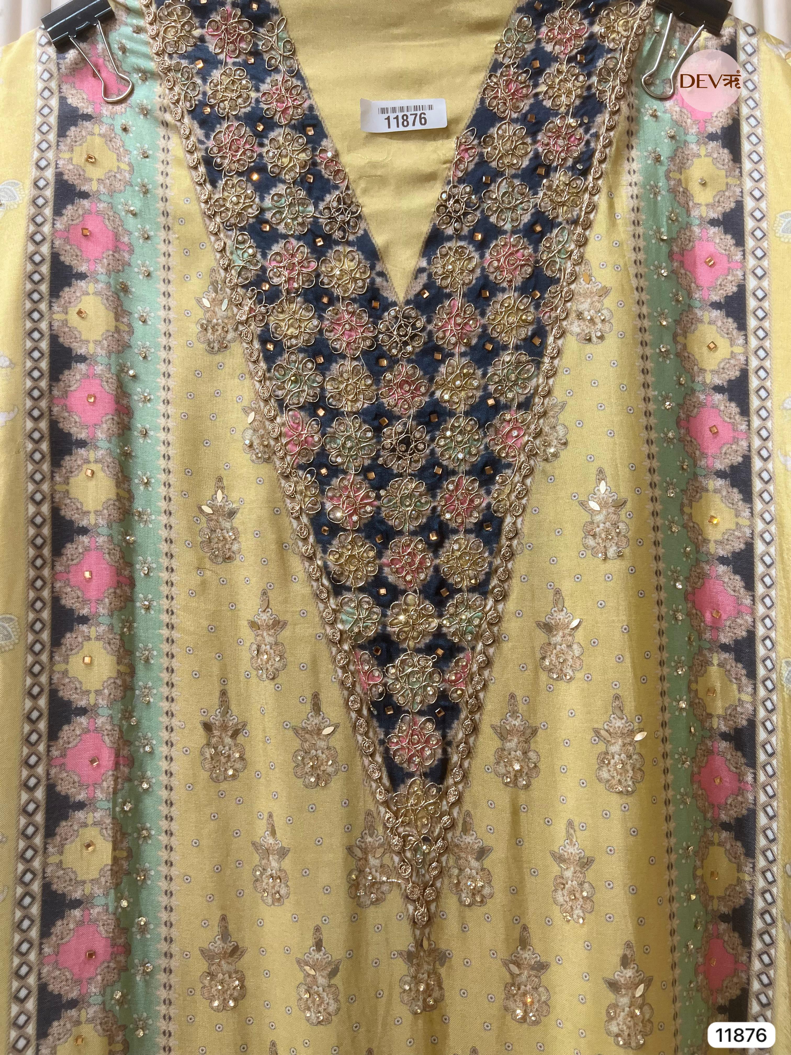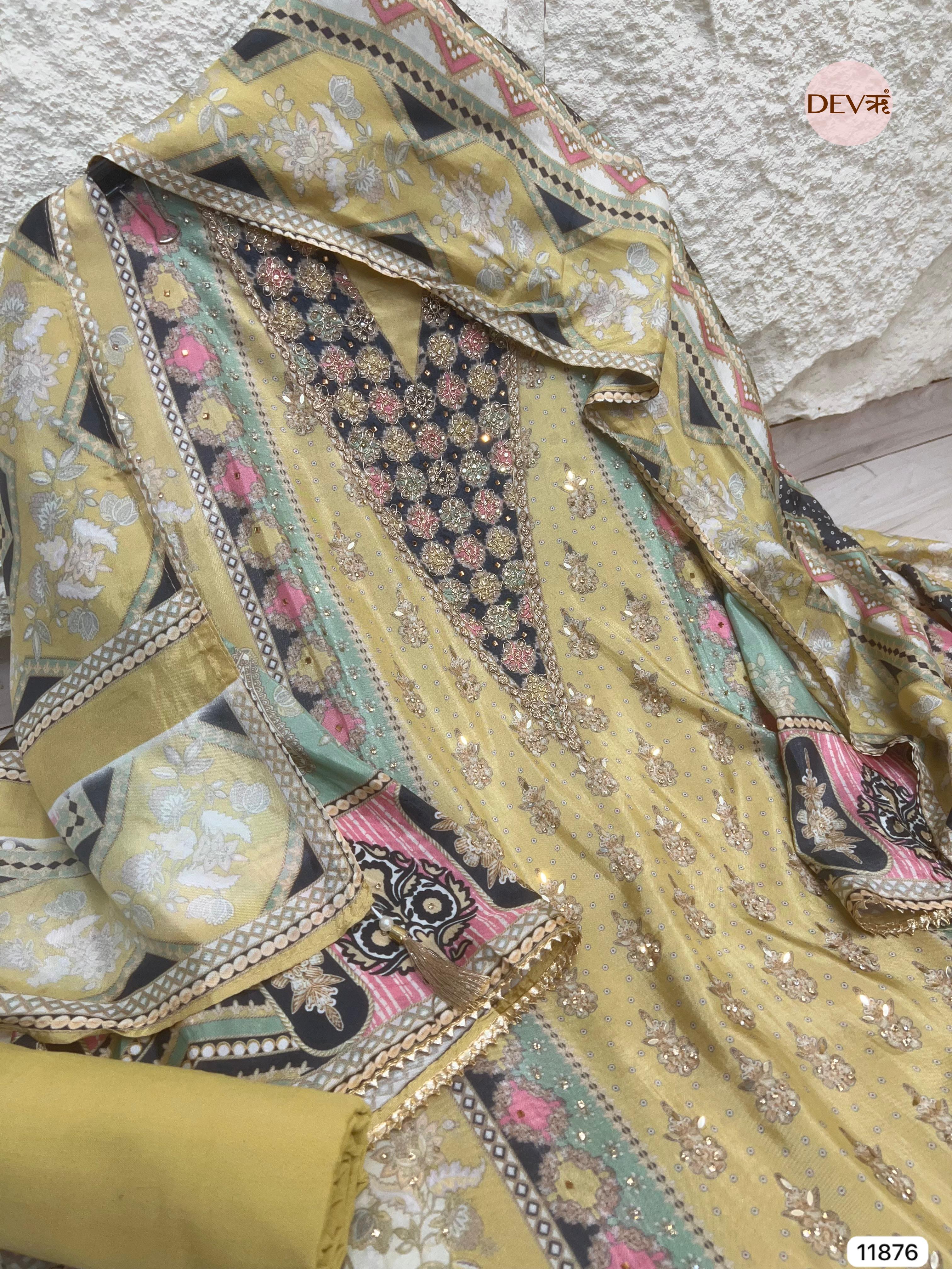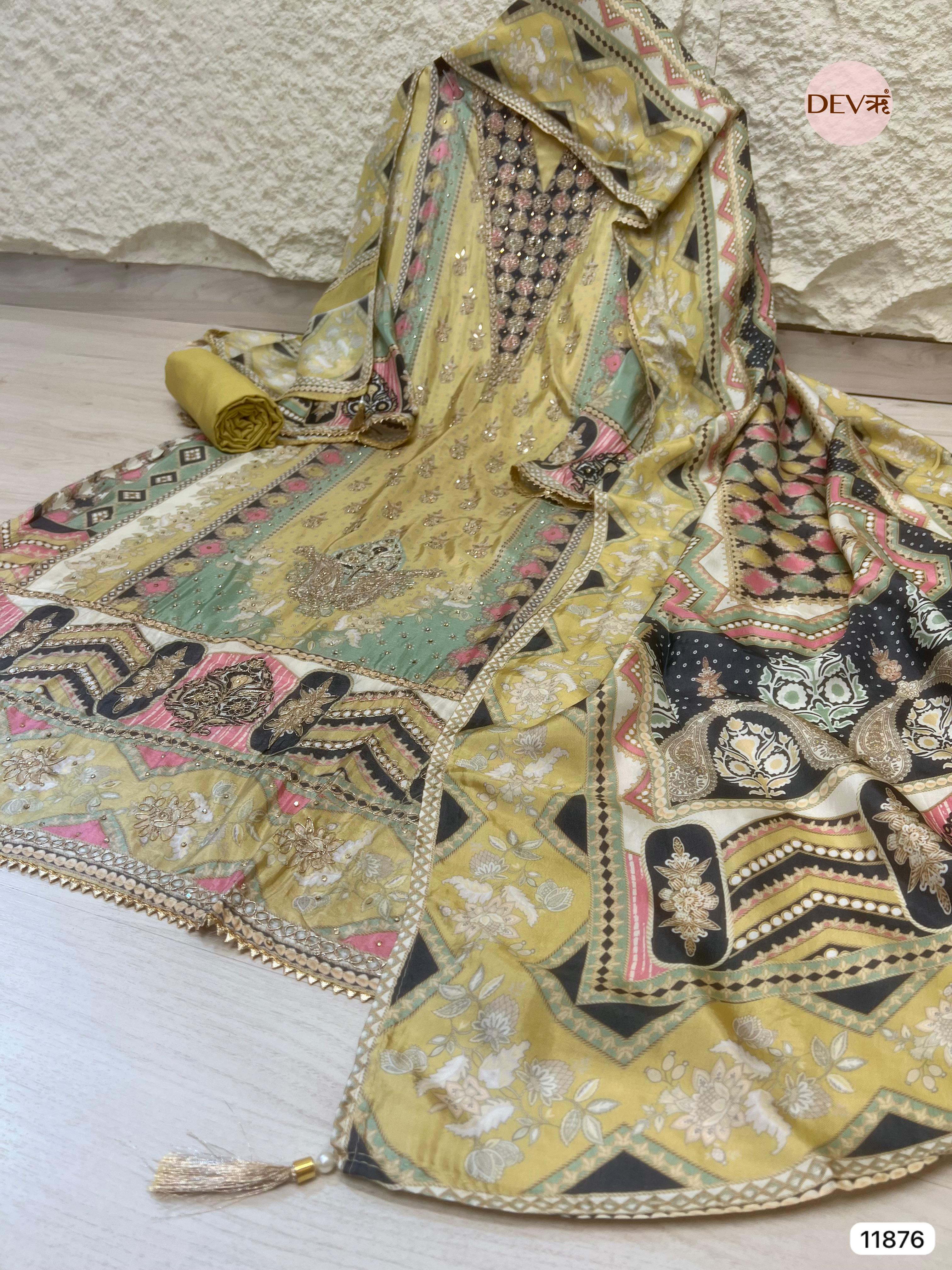 Yellow Glass Silk Semi Stitched Pakistani Printed Hand Embroidered -Set Of 3