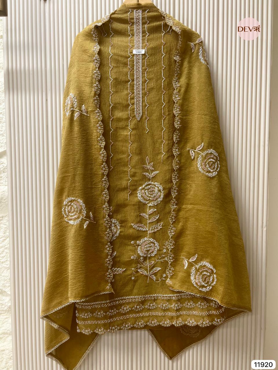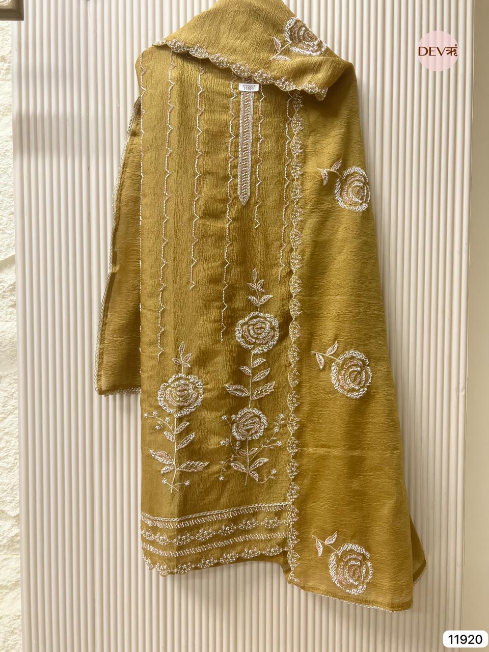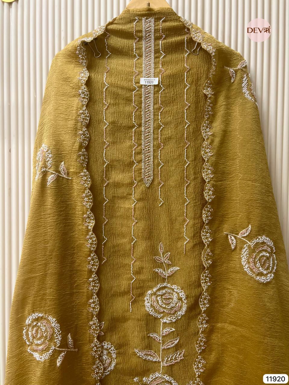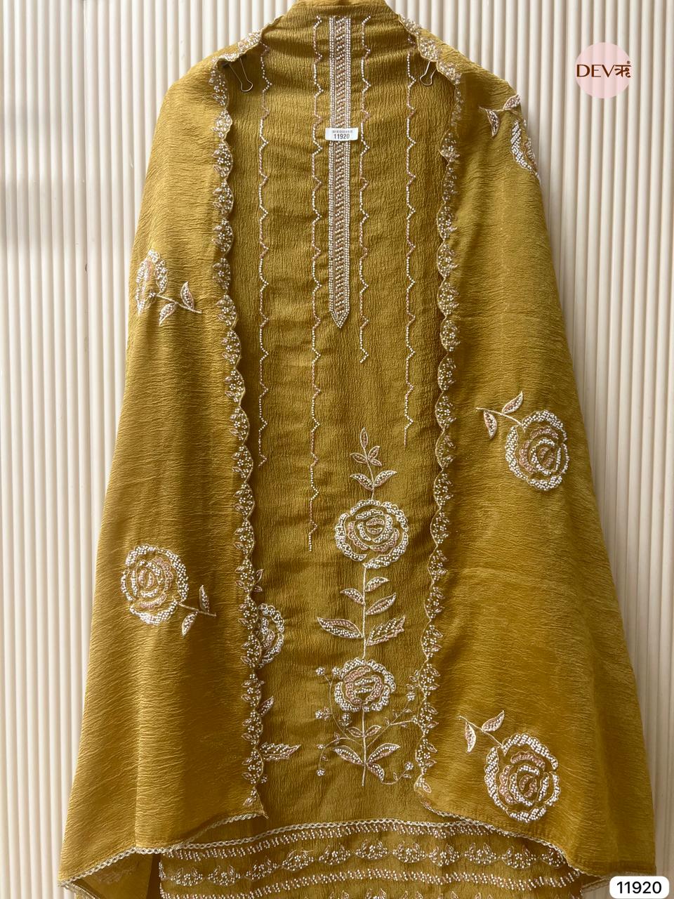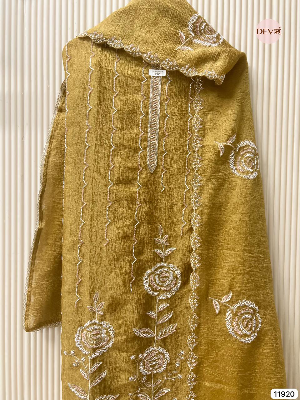 Yellow Pure Tissue Crush Unstitched Hand Embroidered -Set Of 3 - {11920}