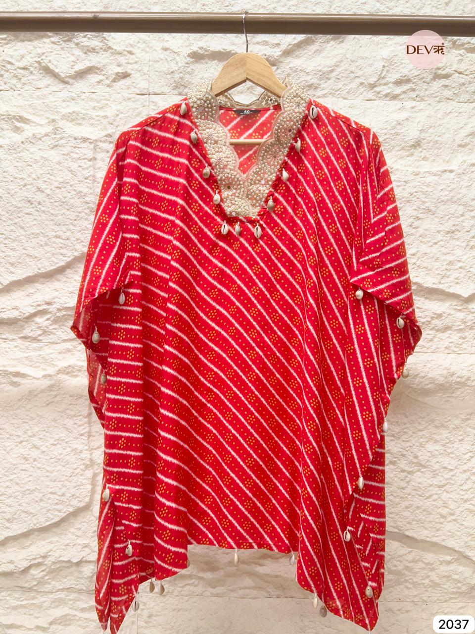 A vibrant ensemble in pure muslin, this breezy red kaftan-style top pairs effortlessly with wide printed bottoms, creating a lively silhouette. The subtle detailing around the neckline adds refinement, while the fluid drape keeps the look light, festive, and effortlessly graceful.