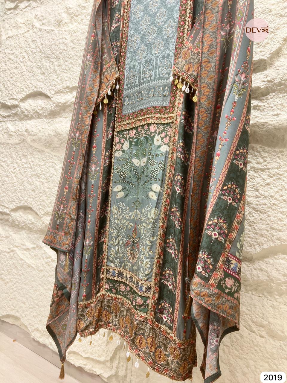 A serene ensemble in cool teal and muted grey, enriched with intricately layered prints and ornate borders. The design flows effortlessly with its soft muslin drape, while the refined palette and delicate detailing create a graceful, understated elegance.